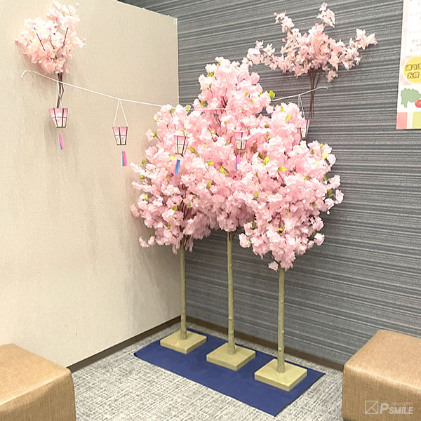 桜モチーフのビニール幕で春らしい柔らかな空間を演出します。