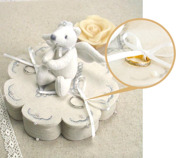 羽根の生えたベアが座っているかわいいデザインのリングピロー。