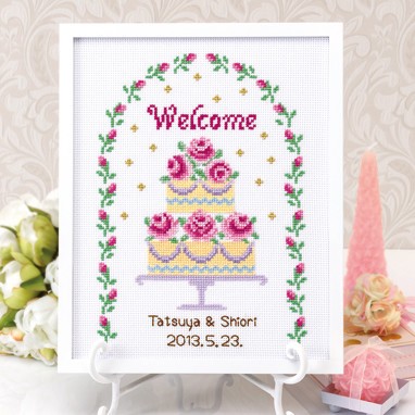 バラをあしらったウェディングケーキの刺繍のウェルカムボードキットです。