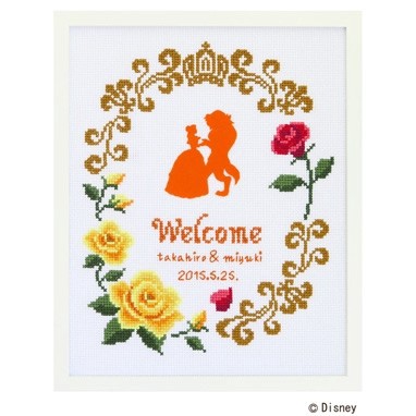 ディズニーアニメ、美女と野獣のシルエットが描かれた刺繍のウェルカムボードキットです。