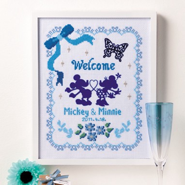 ミッキーマウスとミニーマウスが描かれた刺繍のウェルカムボードキットです。