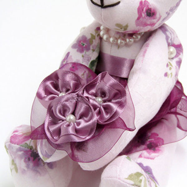 シックな紫色の花のプリント生地にサテンのリボンやローズ、パール、オーガンジーなどを合わせた、デザイン性の高いオリジナルのウェルカムベアです。