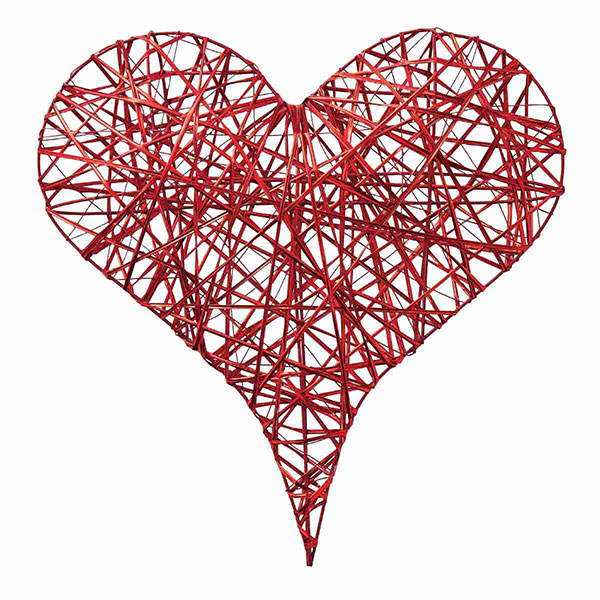 バレンタイン用の真っ赤なハートとバラの卓上アレンジメント。