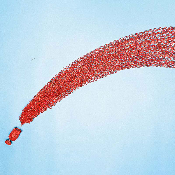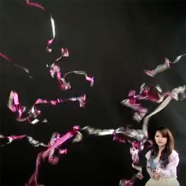 ストッパーを外して投げるだけで、約5mのカラフルなメタルテープがフワッとクモの巣状で宙に広がります。