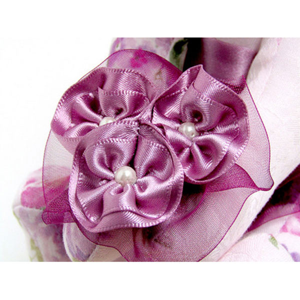 シックな紫色の花のプリント生地にサテンのリボンやローズ、パール、オーガンジーなどを合わせた、デザイン性の高いオリジナルのウェルカムベアです。